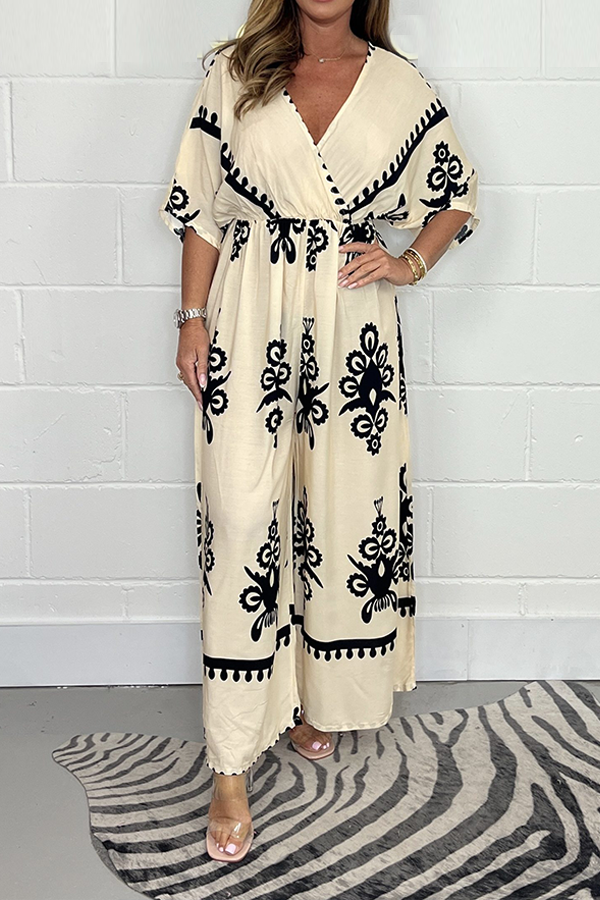 V-neck lace-up print loose jumpsuit