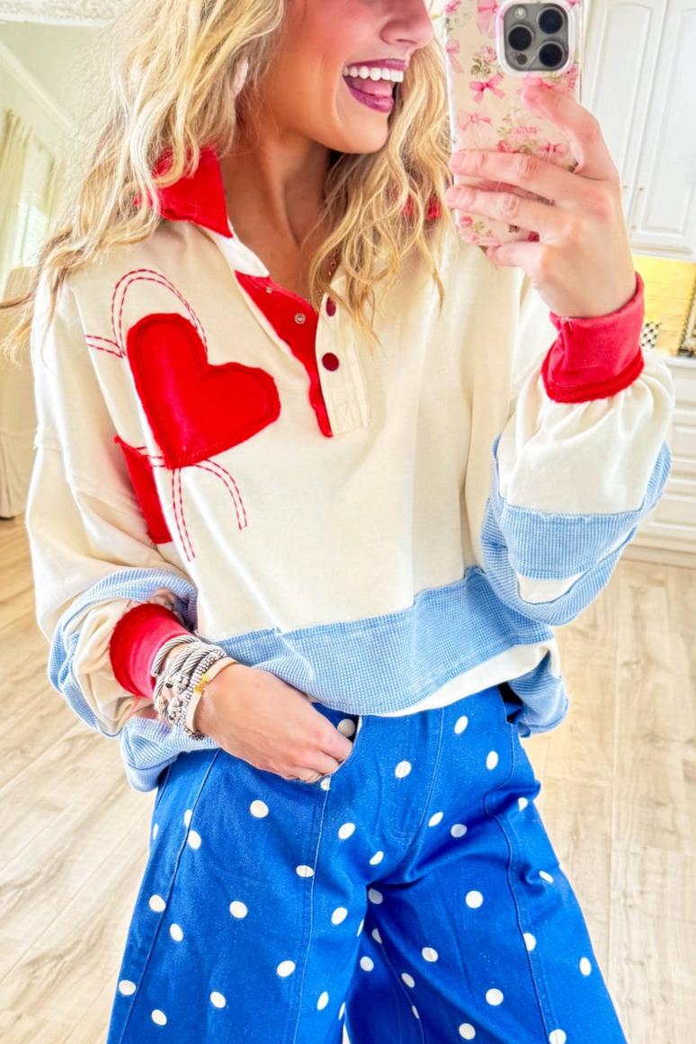 We are so glad you clicked on our new Cream Heart Patchwork Rugby Top because we really love its casual vibe! The top design makes it a great choice for any fashion girl.
