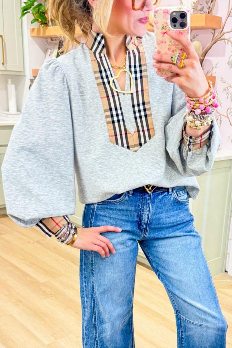 We're glad you've clicked on our new Heather Grey and Taupe Accent Blouse as we're really into its casual vibes! The blouse cut make this a great choice for any stylish girl.