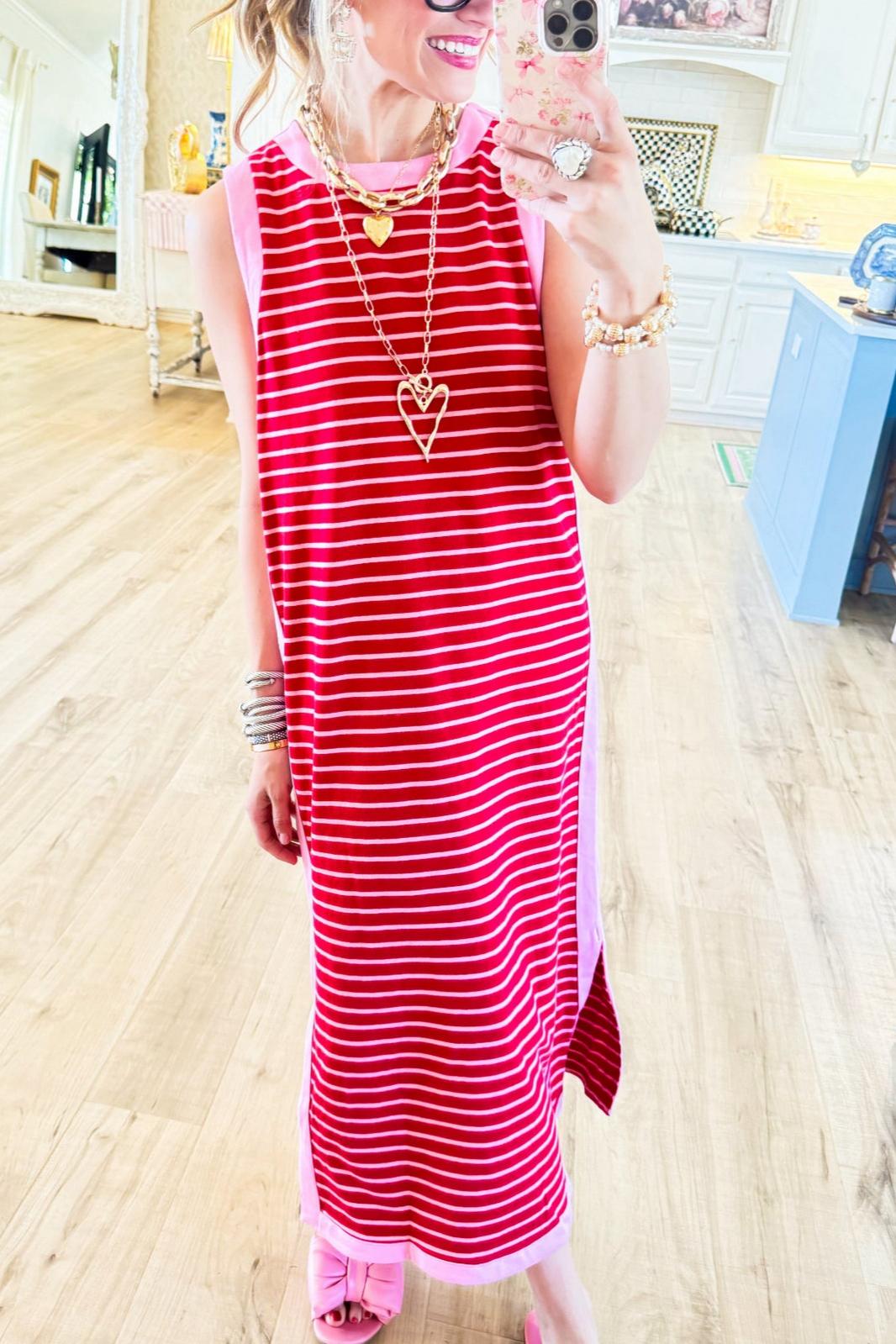 We are so glad you clicked on our new Pink and Red Striped Sleeveless Midi Dress because we really love its casual vibe! The kaftan design makes it a great choice for any fashion girl.