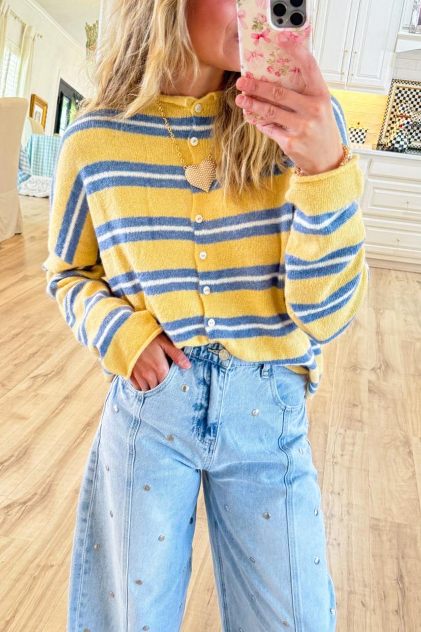 We're glad you've clicked on our new Yellow and Blue Striped Cardigan as we're really into its casual vibes! The top cut make this a great choice for any stylish girl.
